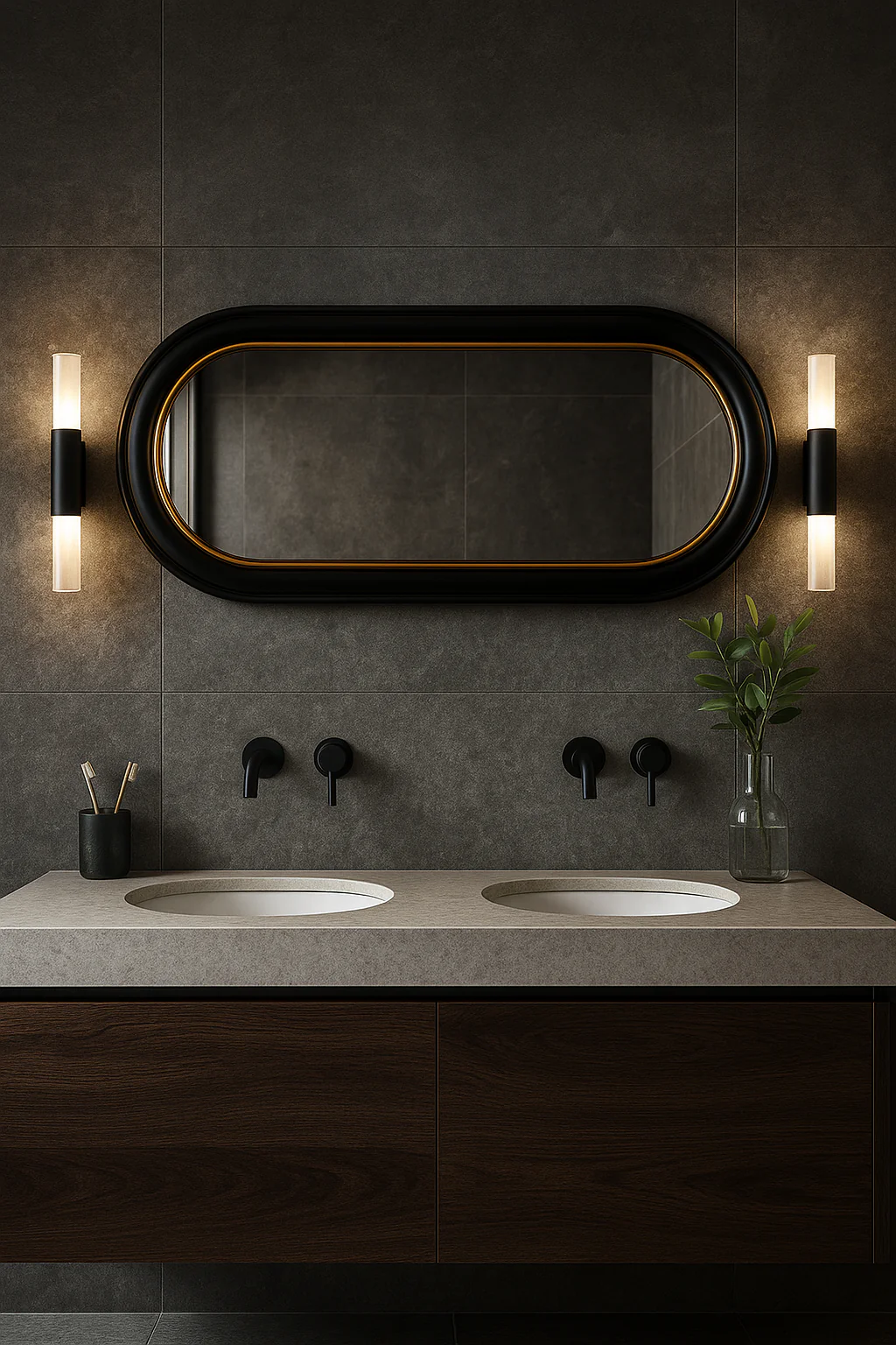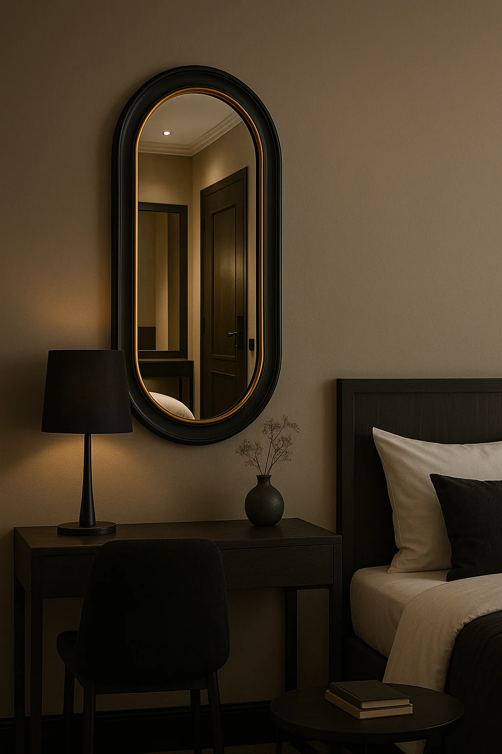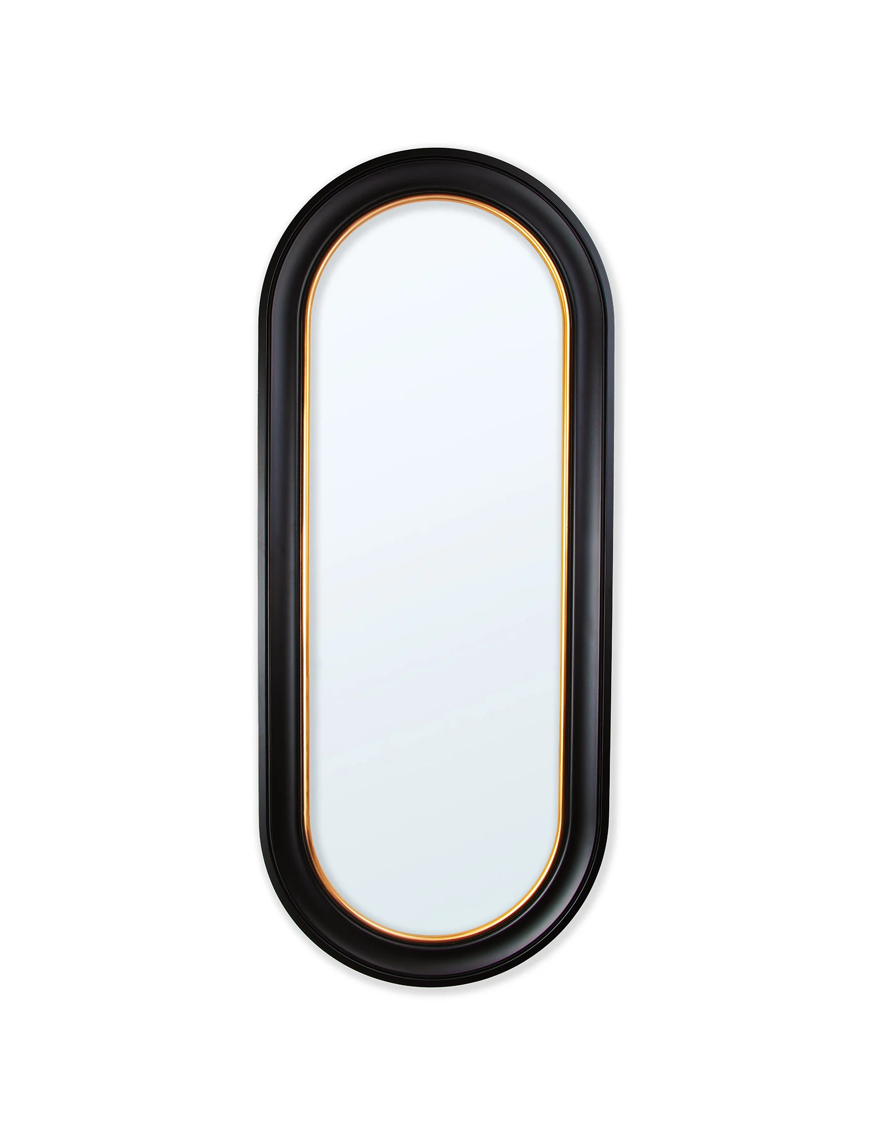 Our timeless Black & Gold Pill Mirror – This bespoke pill shaped mirror, handcrafted in-house, offers a chic and modern aesthetic to any room. Its sleek black frame with gold accent provides a bold, minimalist look, ideal for contemporary interiors or adding contrast to lighter decor.