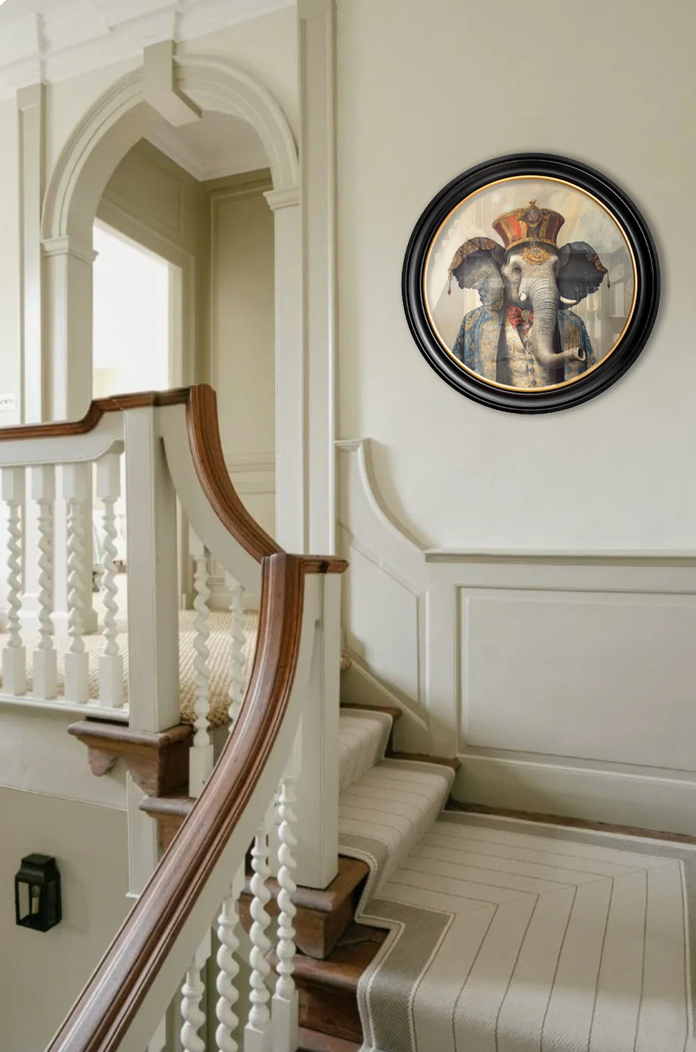 The Great Elephanto Artwork in a Round Black & Gold Frame